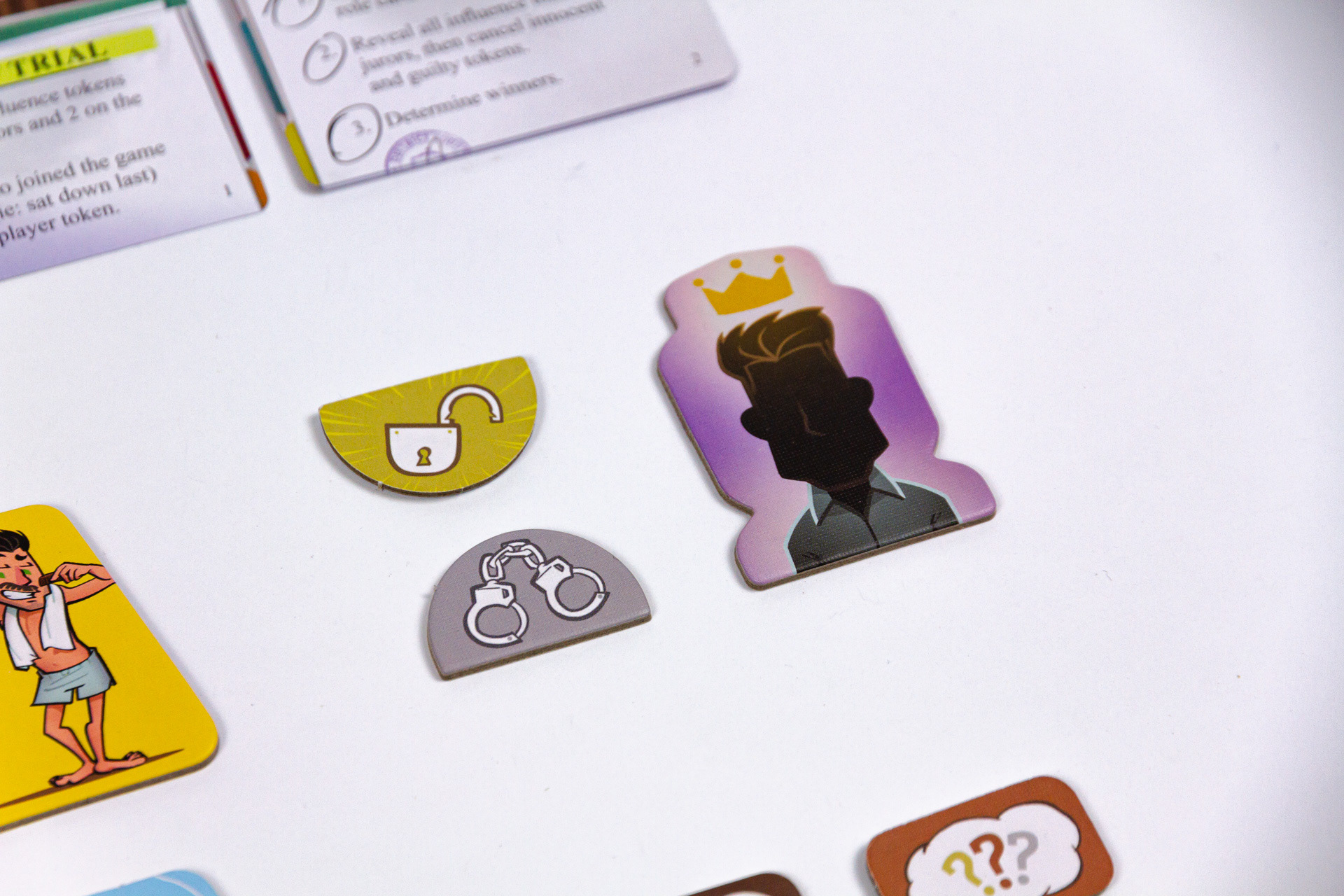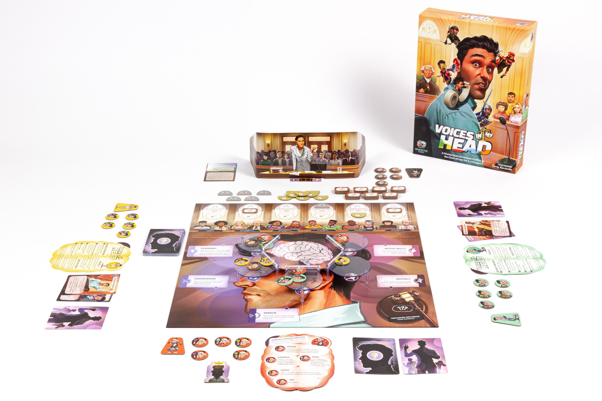 In Voices In My Head, players step into the courtroom and into the mind of a man on trial for robbing a bank. One player takes on the role of the prosecutor who is trying to convict the defendant, Guy, and send him to prison; everyone else takes on aspects of Guy's personality, such as Honesty or Selfishness, and attempts to influence the trial. To win the game, each player must achieve their hidden goal.